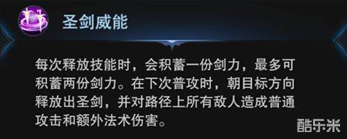 被动技能【圣剑威能】:强化普攻,释放到位的话可以在对线中更好的进行消耗,对清兵也很有帮助(小技巧,每次回到泉水时可以提前积蓄剑力,在回到线上后打出最高的爆发)。