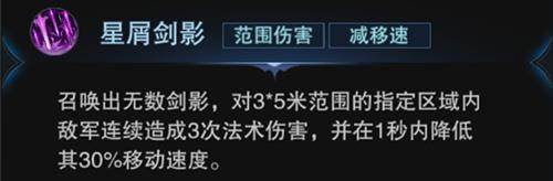 一技能【星屑剑影】:造成多段伤害,优点是CD短、施法比较灵活、技能中的减速效果无论骚扰还是消耗都很有用,缺点是伤害较低,爆发不足。