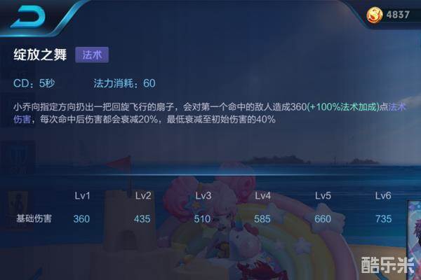 一技能:绽放之舞,小乔向指定方向扔出一把回旋飞行的扇子,会对第一个命中的敌人造成一定法术伤害,每次命中后伤害都会衰减。