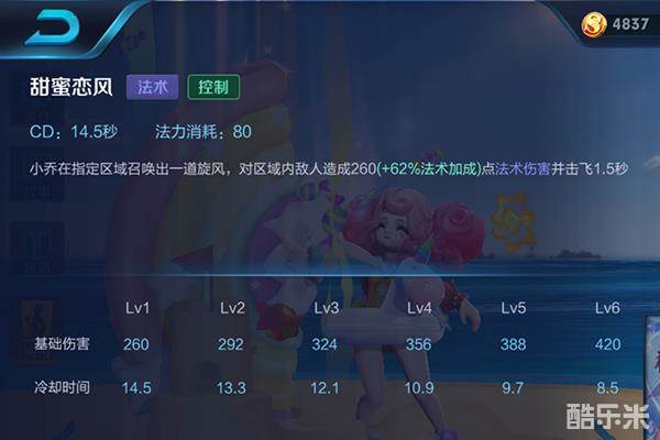 二技能:甜蜜恋风,小乔在指定区域召唤出一道旋风,对区域内敌人造成大量法术伤害并击飞敌人。