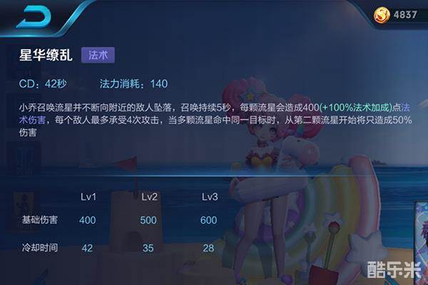 三技能:星华缭乱,小乔召唤流星并不断向附近的敌人坠落,每颗流星会造成定量法术伤害,当多颗流星命中同一目标时,从第二颗流星开始伤害衰减。