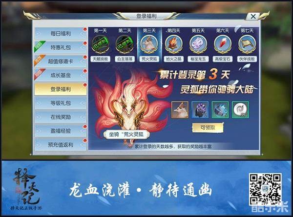 (2)登录福利,开服前七日玩家上线每天都能领取丰厚礼包,包括乙级伙伴白落衡、坐骑九尾妖狐等珍贵奖励;