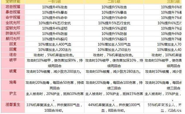 详细讲讲梦幻飞仙几大职业的带的宠物技能建议: