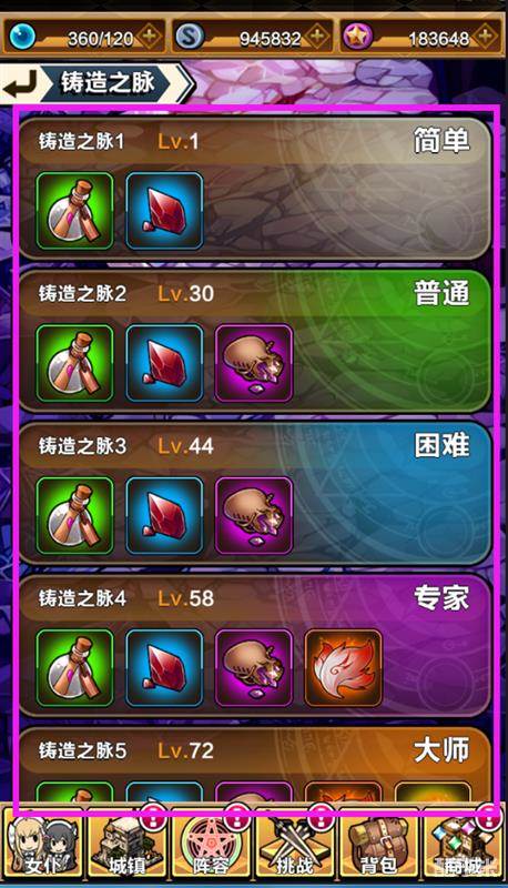 铸造之脉挑战分为简单、普通、困难、专家等级别,上下拉动鼠标可显示出隐藏的等级,根据冒险者的等级、战斗力选择适合挑战的级别,挑战等级越高,获取的锻造材料越多!.