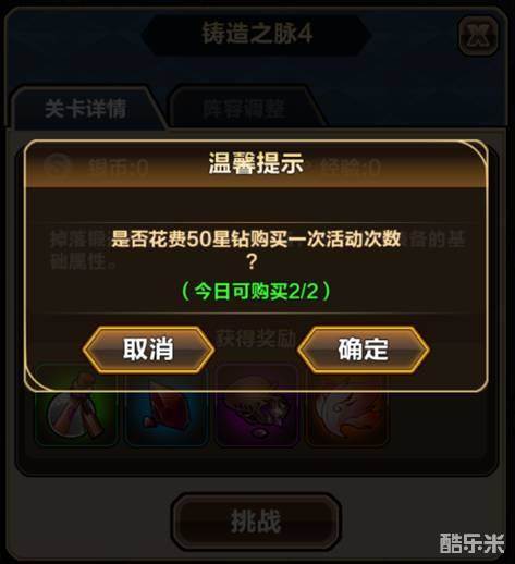 铸造之脉每天可以免费挑战1次,每日可购买2次活动哟,购买一次只需花费50星钻啰!