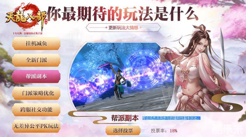 《天龙八部手游》决战少室山不仅仅是全新帮会副本,也会是玩家获得武魂打造道具的重要渠道,堪称集帮会之力的荣誉和奖励之战。想不想尽快体验到决战少室山?那就快参加新一期的更新玩法猜想活动,投出支持的一票吧!
