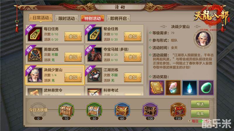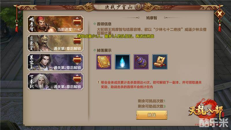 江湖恶人觊觎武林盟主之位,千年古刹再起风波!决战少室山副本是《天龙八部手游》蓄势推出的全新帮会副本,顾名思义即需要加入帮会才可以参加活动,已加入帮会且角色等级达到79级,即可组队挑战决战少室山副本。在组队人员要求上,最少需要3人,最多限制5人,并且必须都属于同个帮会。