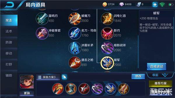 出装:贪婪之噬、急速战靴、泣血之刃、暗影战斧、破军、无尽战刃