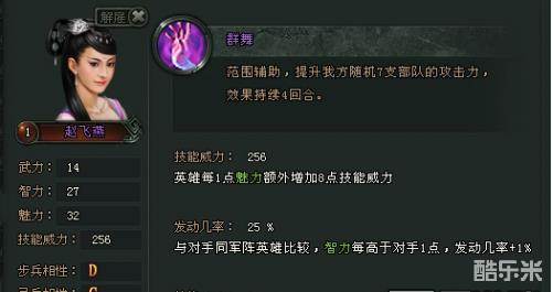 如图所示,赵飞燕的技能为群舞,主要属性为魅力和智力。则该武将将侧重于魅力和智力的培养