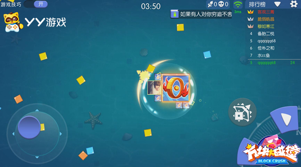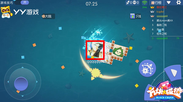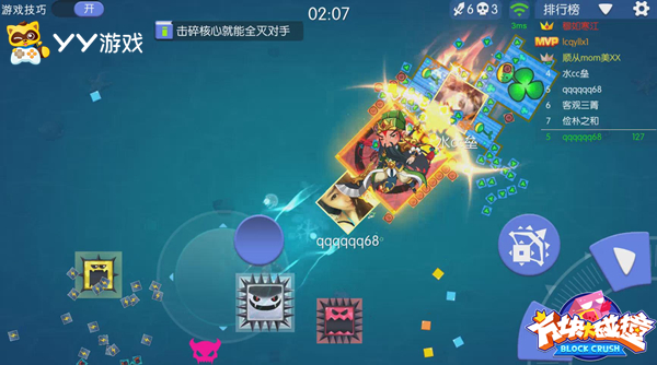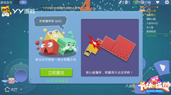 游戏一开始,每名玩家以可自定义的头像为中心形成了核心方块范围,一旦核心被撞碎,再大的附属方块也会随之一起消失。