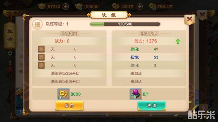 坐骑成长。这是一条非常重要的成长线,虽然坐骑并不多,但坐骑属性会加成到角色身上,当前出战的加成为200%,其余为100%,坐骑可以升星和洗练从而获得更多的属性加成,对于游戏初期角色属性维度的增加十分有效,同时也是战力提升的重要方式。洗练理论上来说并没有上限,不过提醒各位玩家要量力而行。