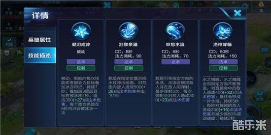 甄姬在指定位置召唤水柱冲出地面,对范围内接触的敌人造成500(+70%法术加成)点法术伤害并击飞1秒。