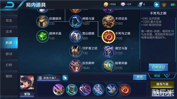 破军提供较高的物理攻击,被动-破军还能提高对半血以下敌人所造成的伤害,极大提高娜可露露的输出;不死鸟之眼除了提供法术防御和最大生命值加成外,被动-血统能提高娜可露露二技能命中敌人后的生命回复效果。