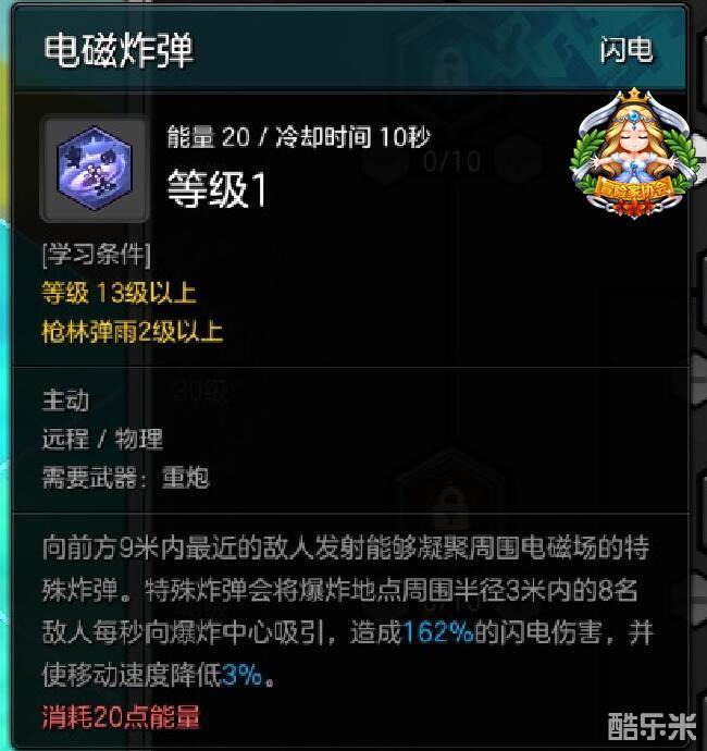 电磁炸弹:向前方发射电磁炸弹,对第一个命中的敌人产生向半径3米范围内吸引的爆炸圈,对目标造成伤害的同时使其移动速度降低。