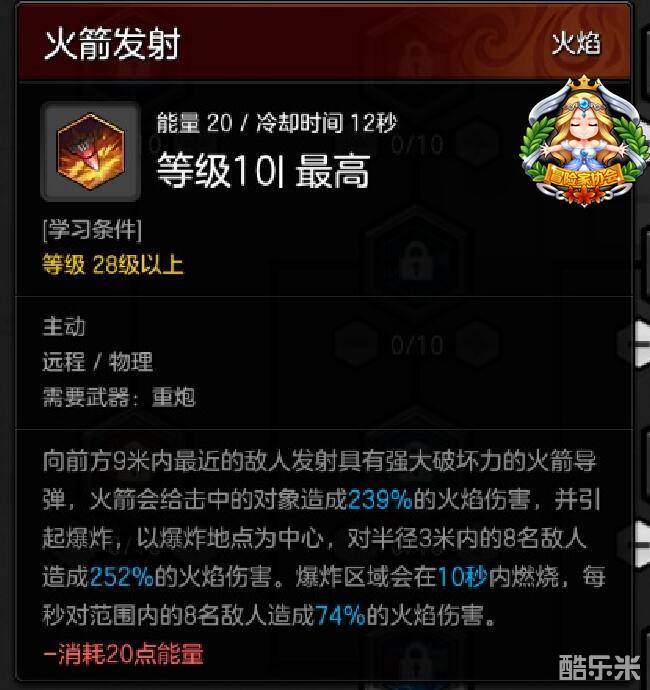 火箭发射:向前方9米发射火箭弹,造成伤害且爆炸后引燃范围区域造成持续伤害。