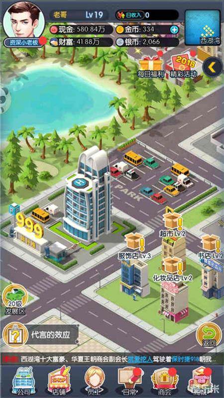 招聘完员工就是买地皮建店铺了,超市、服饰店、化妆品店,一间接一间的建,合理安排员工,经常搞点店铺促销,这样就会赚得盆满钵满啦。