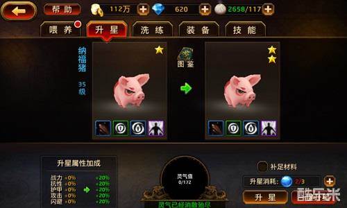 除此之外,主公还可通过喂养和洗练来提升灵宠的战力,在商店中可以购买食物为它们升级,并使用属性洗练提升它们的属性。属性洗练分为消耗金币的普通洗练和消耗钻石的高级洗练。在洗练中,灵宠的抗性、护甲、攻击、闪避属性都有可能得到提升或减少,使用高级洗练则有更高的几率洗出好属性。当然,若是对当次洗出的属性不满意,主公也可选择维持原有属性。