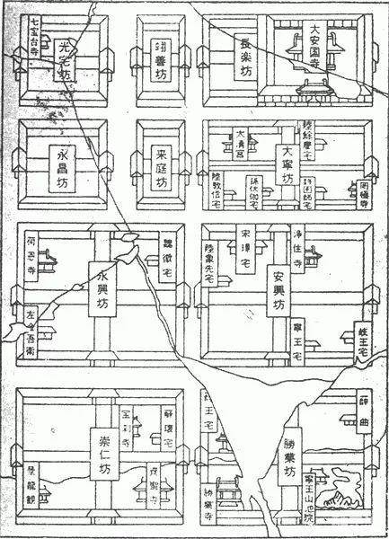 坊是长安城的特色建筑。历史上的坊有点像成阵列状规模的四合院,夜晚宵禁时,所有娱乐与生活都只能在坊间进行。