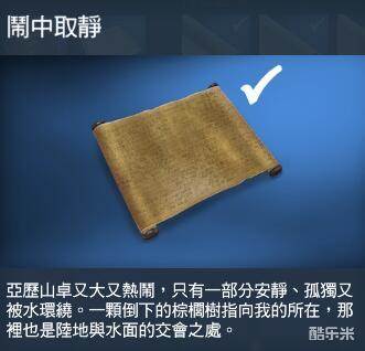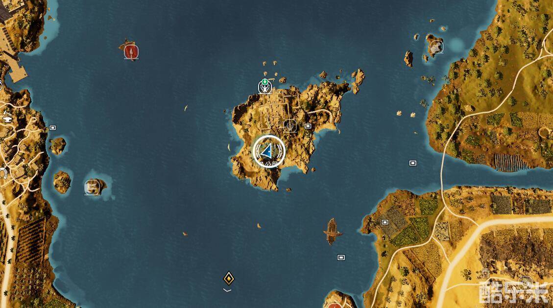 亚力山卓,位于亚力山卓区域中心的一个小岛上,在小岛的西边有颗倒了的棕榈树,顺着倒的方向一路走到海边就可以拿到宝物了。具体位置我记不太清了,不过应该就是在这一块,用animus扫描一下就好