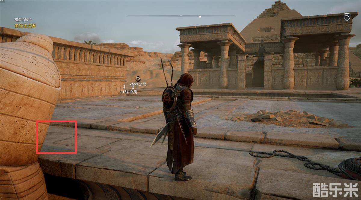 大屋行省,位于西南方金字塔鸟瞰点的正南方向。传送后一路向南走,会看到一个鳄鱼雕像,然后继续往南走会看到一个法老石像,宝物就在那石像漏出来的半截脑袋后面