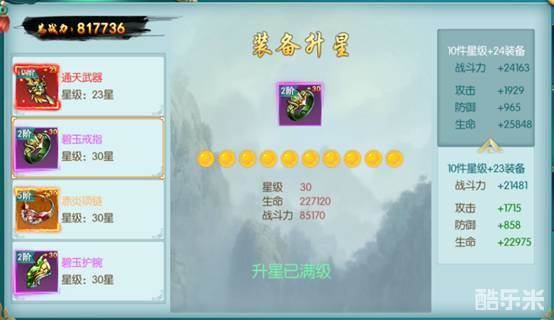 强化人物装备,提升战力;消耗一定数量的强化石强化装备,成功率百分百,装备星级越高,消耗的强化石也就越多。最高可以升到30级,强化到一定条件有额外属性加成。