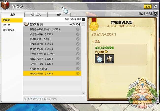 升级除了主线任务之外还有支线任务,支线任务虽然经验少,不算上是快速得到经验的方法,但是做支线任务中有许多好玩的乐趣。按M键在地图上会出现许多蓝色的感叹号,蓝色感叹号的意思就是可以接受的支线任务。