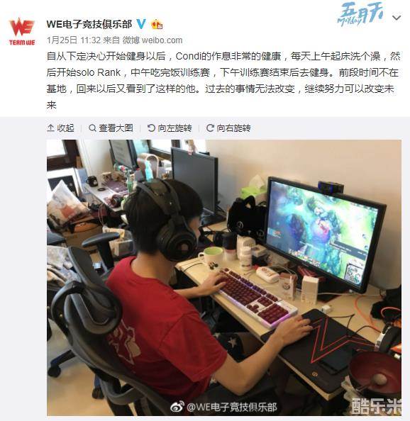 自从下定决心开始健身以后,Condi的作息非常的健康,每天上午起床洗个澡,然后开始solo Rank,中午吃完饭训练赛,下午训练赛结束后去健身。前段时间不在基地,回来以后又看到了这样的他。过去的事情无法改变,继续努力可以改变未来