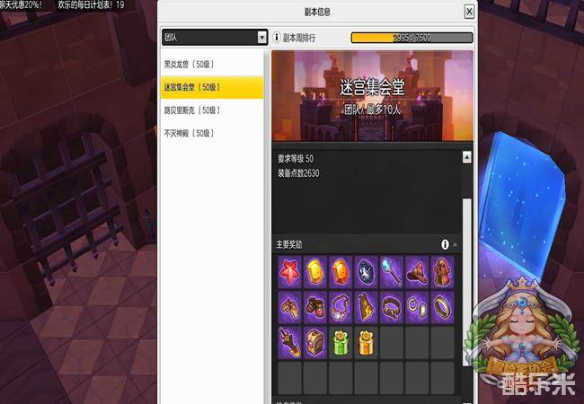副本名称:迷宫会堂 装备点数:2630 副本人数:10人副本 副本次数:5次(每个星期五更新次数,所以每个星期五之前一定要记得打完) 副本掉落:黑爵巨剑、50级紫装、首饰、混沌玛瑙、宝石箱子等