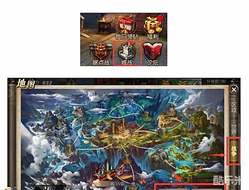点击主界面“城战”图标或点击地图进入“战争”界面进行报名。