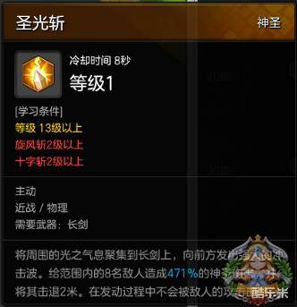 评价:该技能是骑士最强爆发技能,而且不消耗能量,在后期点满的情况下,圣光斩的爆发在暴击的情况下可以造成成吨的伤害。