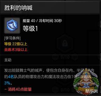 评价:骑士原地释放无敌,保护队友。需要注意的是,7级就可以保护10个队友,提升等级可以减少冷却。建议提升到8级,1分钟的冷却时间,基本够用。