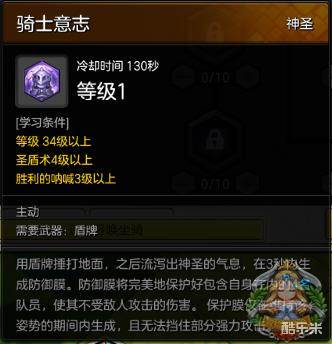 评价:该技能同骑士意志。但是需要注意的是,该技能会冲到队友脚下。所以,释放的时候,请务必注意自己面向有没有队友,否则很可能出现释放位置错误导致团灭。一般的情况下不需要点出该技能。目前团队副本,不灭神殿,需要点到7级,其它副本点1级保命即可。