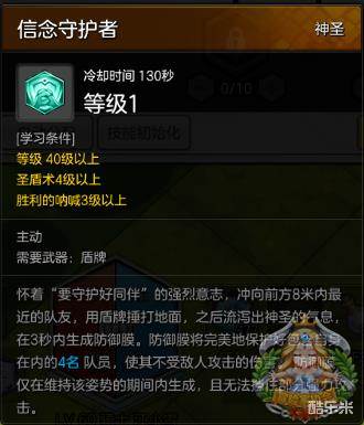 评价:没有该技能的支撑,骑士的能量根本不够用。所以在副本中基本全程保持。当你熟练使用该技能后,可以通过转换该技能,在需要爆发的时候,取消钢铁防御来增加输出。