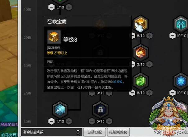 召唤金鹰我们选择点出8点,因为这个技能可以说是给你固定的增加一个增加敏捷的buff,我们都知道弓箭手的主属性就是敏捷,所以收益还是非常可观的,这里需要注意在使用雄鹰突击这个技能的时候,要等到召唤金鹰的buff快消失时在使用,因为雄鹰突击一使用,老鹰消失给我们的buff加成也会消失。