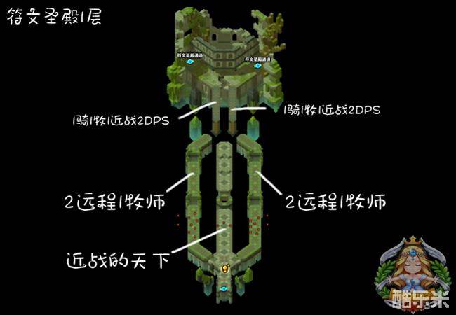 在符文通道中有上下2路,我们称之为北路及南路,一般按照北3南2的配置来进行小怪的清理。