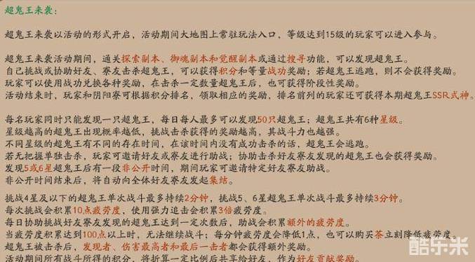 通关探索副本、御魂副本、觉醒副本或通过超鬼王副本界面的搜寻功能,可以发现超鬼王。前三种概率发现,搜寻功能必定发现。搜寻功能有6小时CD。