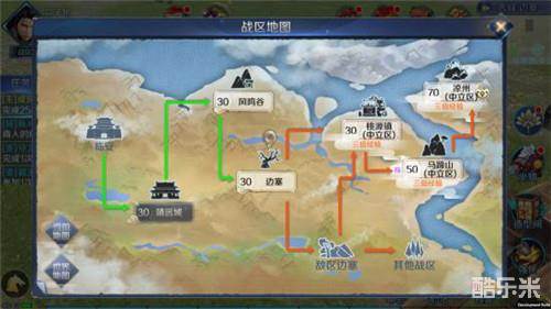 每个战区都有自己的靖远城、凤鸣谷、边塞,玩家可以通过自己边塞的车夫传送到其他战区的桃源镇、马蹄山、凉州是所有战区公用的中立区,中立区怪物是三倍经