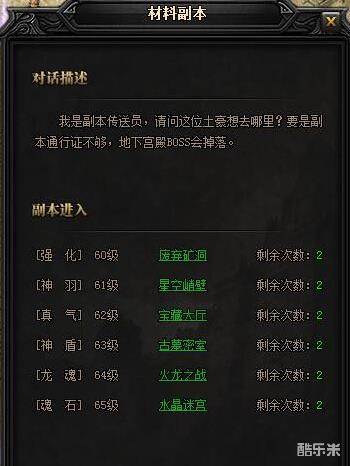 材料副本包括:废弃矿洞、星空峭壁、宝藏大厅、古墓密室、火龙之战与水晶迷宫,每个副本每天可进入2次。由于难度系数的不同,对应的玩家进入等级也不同。材料副本每日0点会重置进入次数,如果你想每天拥有更多通关副本的机会而不浪费,就要在0点刷新之前用完当前进入次数哦!