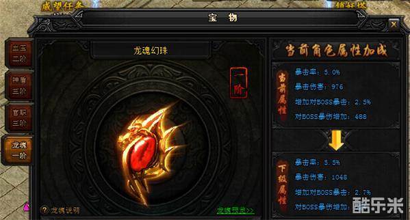 龙魂幻珠一阶状态下,暴击率为1.0%,暴击伤害为478,增加对BOSS暴击为0.5%,对BOSS暴伤增加为239。