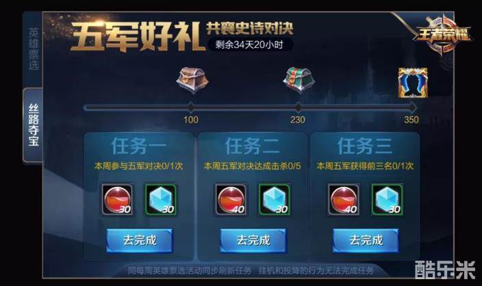 额外的,与团战精神点赞同期每周刷新3个五军对决任务,完成即可获得铭文碎片和五军积分,在整个活动周期内累积积分即可获取丝路好礼,最高可得五军对决专属特效头像框。