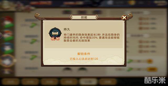 持久:奇门遁甲的隐身效果延长3秒,并且在隐身的持续时间内,命中增加30%,普通攻击能够驱散受击者的无敌效果。