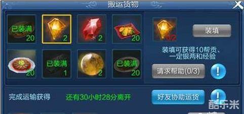 玩家在成功装填满5个货物后,还可以向帮会中的其他成员寻求帮助,让他们帮你装填,帮助者也可以获得相应的奖励,还可获得额外的帮贡点数。