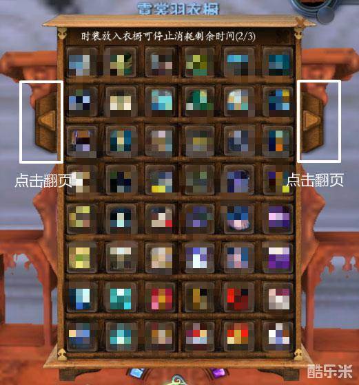家园衣橱一共三页,鼠标点击左右两边的箭头即可翻页。每页8层,每层6格,共144格。每格可从包裹(不可以从随身衣橱)放入一件未过期或永久的时装类道具(时装衣服、时装发型、光环)。