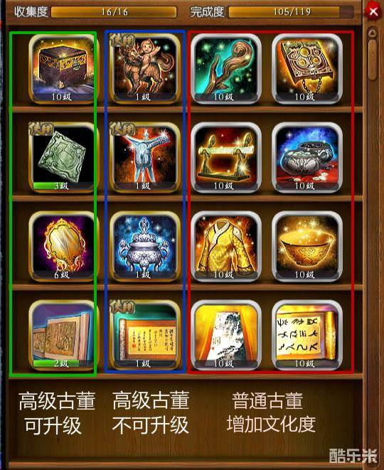 右边两列古董是可升级的普通古董,没有特殊功能,只为家园提供文化度。
