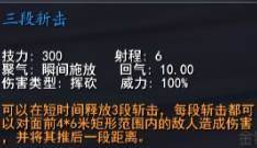 技能二:三段斩击。是面向前方的范围技能,有一个特殊效果是击退。
