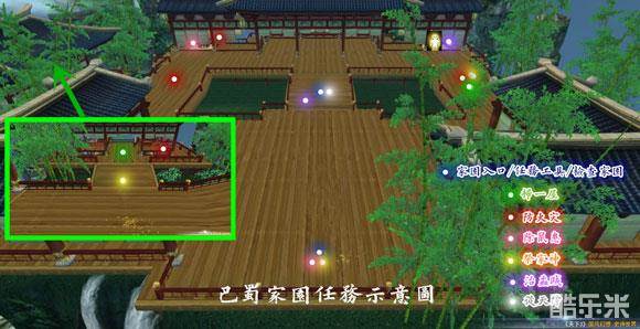 相对来说,巴蜀家园并不是做任务的理想去处。第一,家园入口(返回入口指令)是最下方的蓝色点,而NPC(图中小人位置)距离却在最右上方,返回入口指令的便捷性大打折扣;第二,相同颜色的任务点也是属于比较分散的,需要来回奔波。唯一相对最方便的是【治蟊贼】,布置陷阱和教训蟊贼那两步的任务点就在丫鬟的边上。