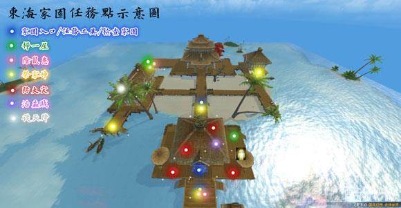 东海家园是我认为做任务最方便的家园,我们可以看到绝大部分的任务点和NPC都集中在家园入口(最下方蓝点)的附近。如果抽到了【防火灾】和【治蟊贼】,我们可以在东海家园里直接做完全程,而【除鼠患】、【祭家神】、【扫一屋】三种任务我们也可以在东海家园中做完1/2(除鼠患可做到消灭老鼠,祭家神可做到使用符咒,扫一屋从击杀癞蛤蟆到结束)再切换家园。