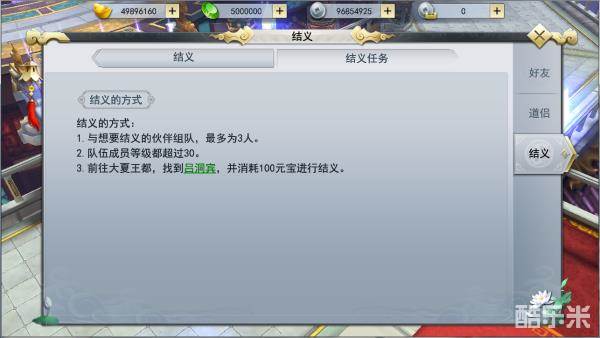 先别说这位吕祖真仙心情如何,结义的事情还是没有半点含糊的。达到30级后,只要与想结义的伙伴组成一队前往与吕洞宾对话,就能看到结义相关的选项啦。在符合结义各项要求的情况下,消耗100元宝,就能成功结义啦!