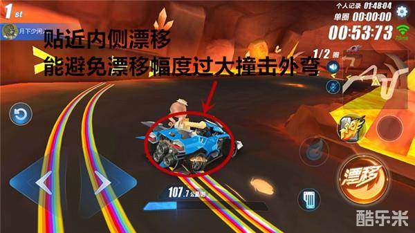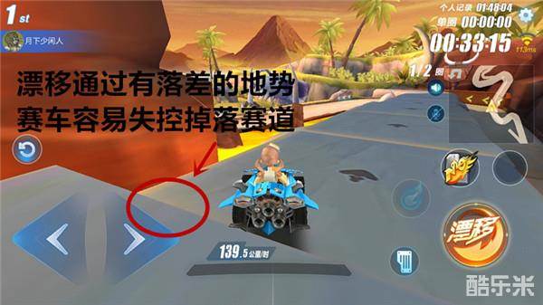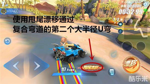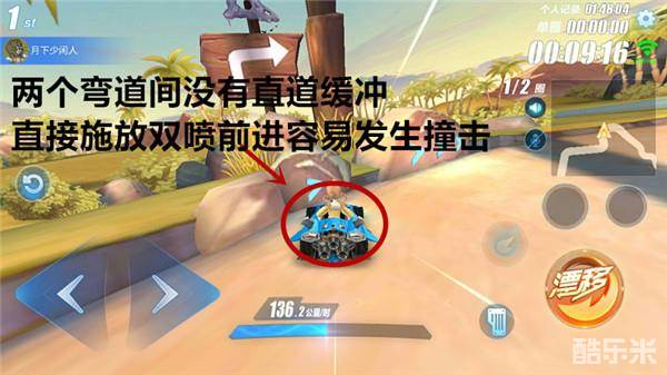 这个难点形成的根本原因在于赛道狭窄,而赛车漂移摆动的幅度很大。那么要解决二者之间的矛盾有两种办法,第一种,过弯时踩刹车或者不施放小喷降低车速;第二种,贴近内侧弯道漂移,同时死死稳住赛车行驶方向,让漂移轨迹呈缓和的曲线。这两种方法都可以遏制漂移时赛车的摆动幅度,不过相对而言第二种方法更加难以掌握,需要不断地从失误中总结经验才能习得。