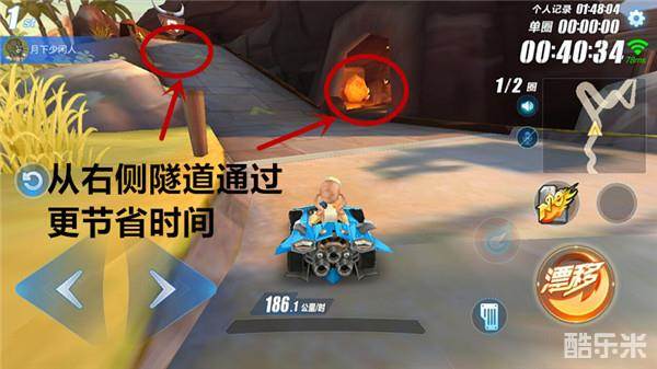 与连环弯道紧连着的是两条岔道,一条是宽阔的大道,一条是狭窄的隧道。从大道行驶需要通过一个U型弯道与L型弯道,而从狭窄隧道通过只需要经过两个L型弯道即可,并且还能比大道多踩上一个加速带。所以车手们在行驶过程中都会一个劲地往隧道里钻,可是隧道狭窄而两个L型弯道又紧邻,所以对漂移角度掌控不完美的车手百分百会发生碰撞。